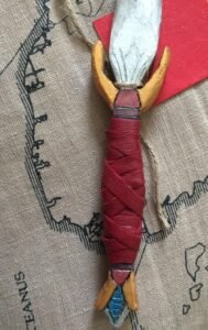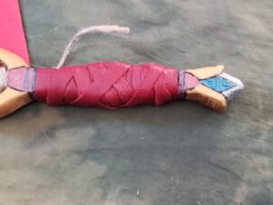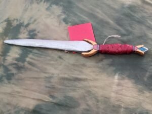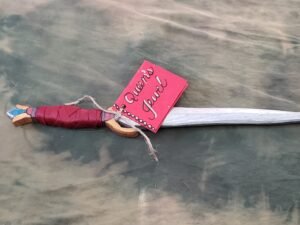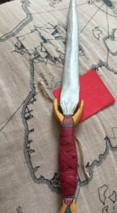 Queen’s jewel is a boot dagger, made to look royal, with a sparkly, metallic blade, a metallic orange gold guard, a diamond-inspired pommel, and a red faux leather wrapped handle.